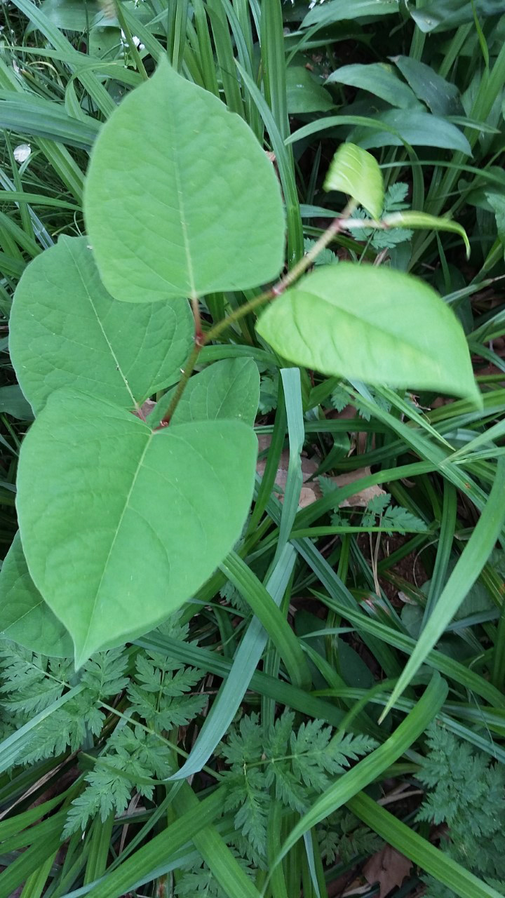 - Links de Japanse duizendknoop (Fallopia japonica) tussen Cypergras en Fluitekruid. De Fallopia is de schrik van tuiniers, met diepe en haast onuitroeibare wortelstokken die overal heenkruipen en uitgroeien tot enorme struiken met mooie witte bloemetjes, dat wel.